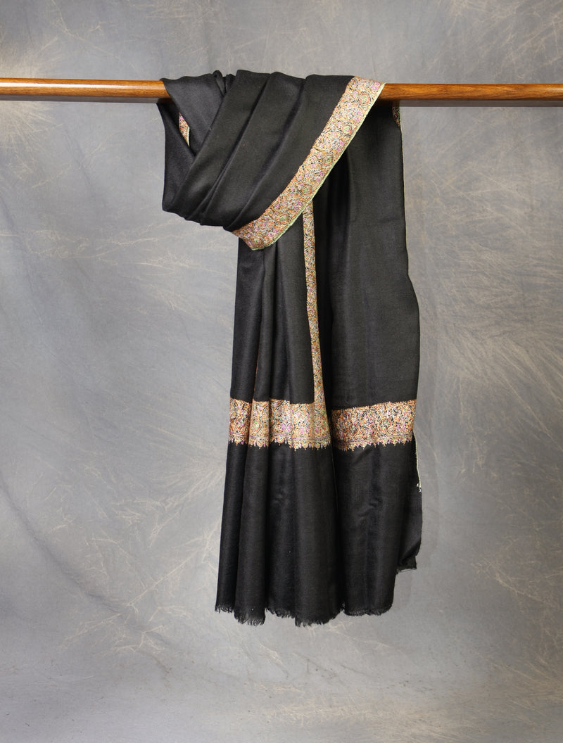 Black Base Big Border Embroidery Cashmere Pashmina Shawl — Authentic Sozni Embroidery Cashmere Pashmina from Kashmir